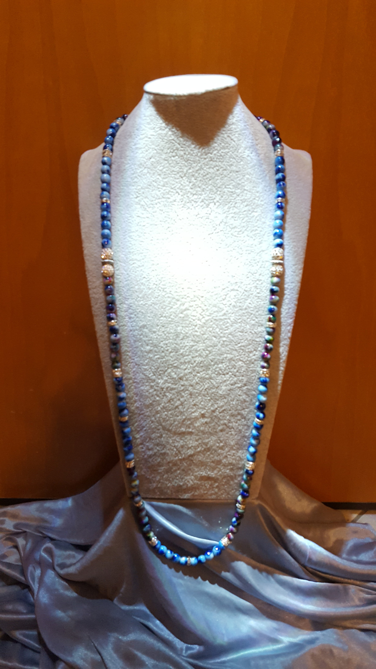 Collana di pietre di giada blu alternata da perle di argilla, incastonate con strass e distanziatori di metallo con strass