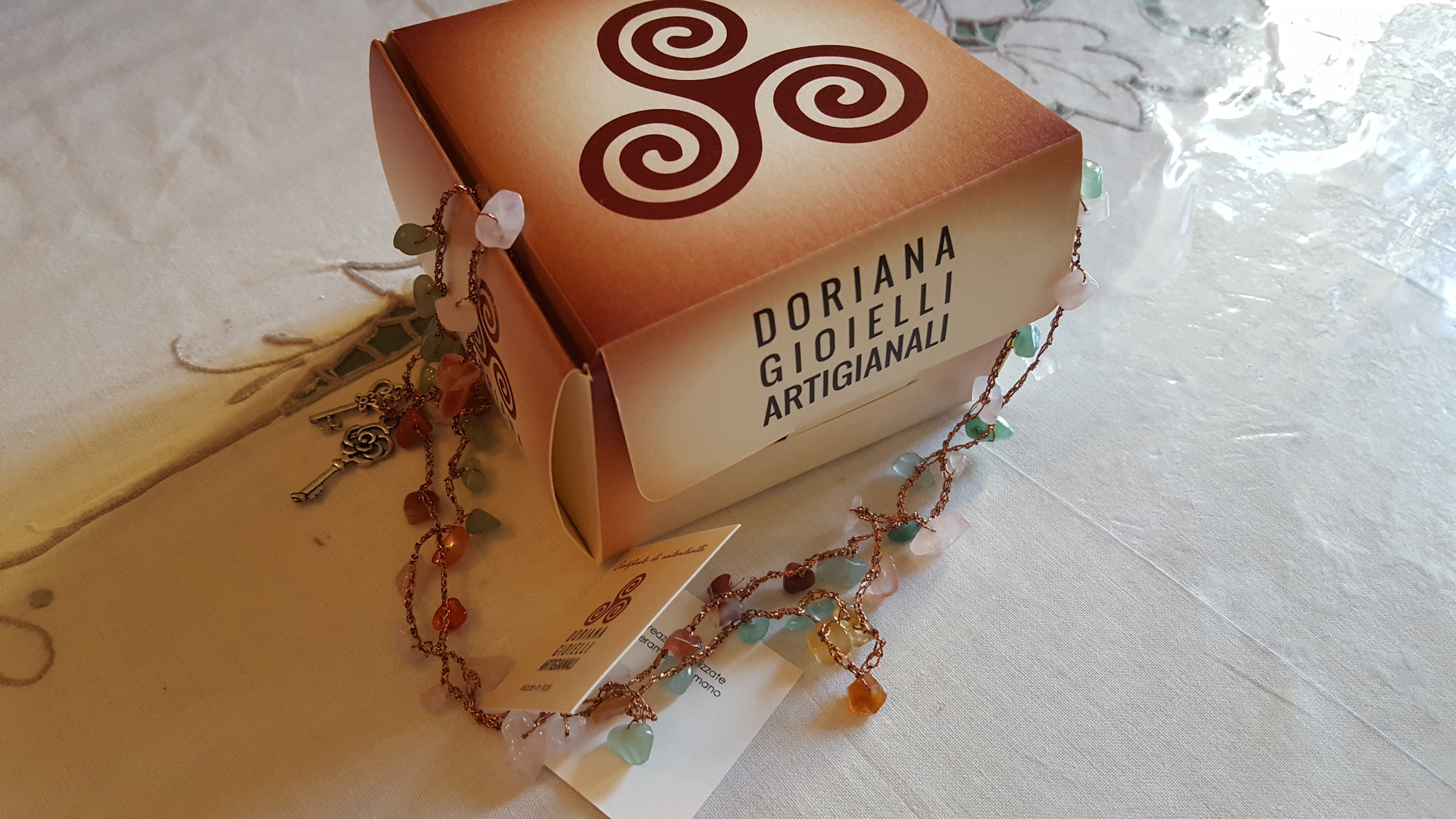 Collana in filo di lamè ramato con pietre dure di avventurina, quarzo ed agata. Tre ciondoli lucchetto e due chiavi